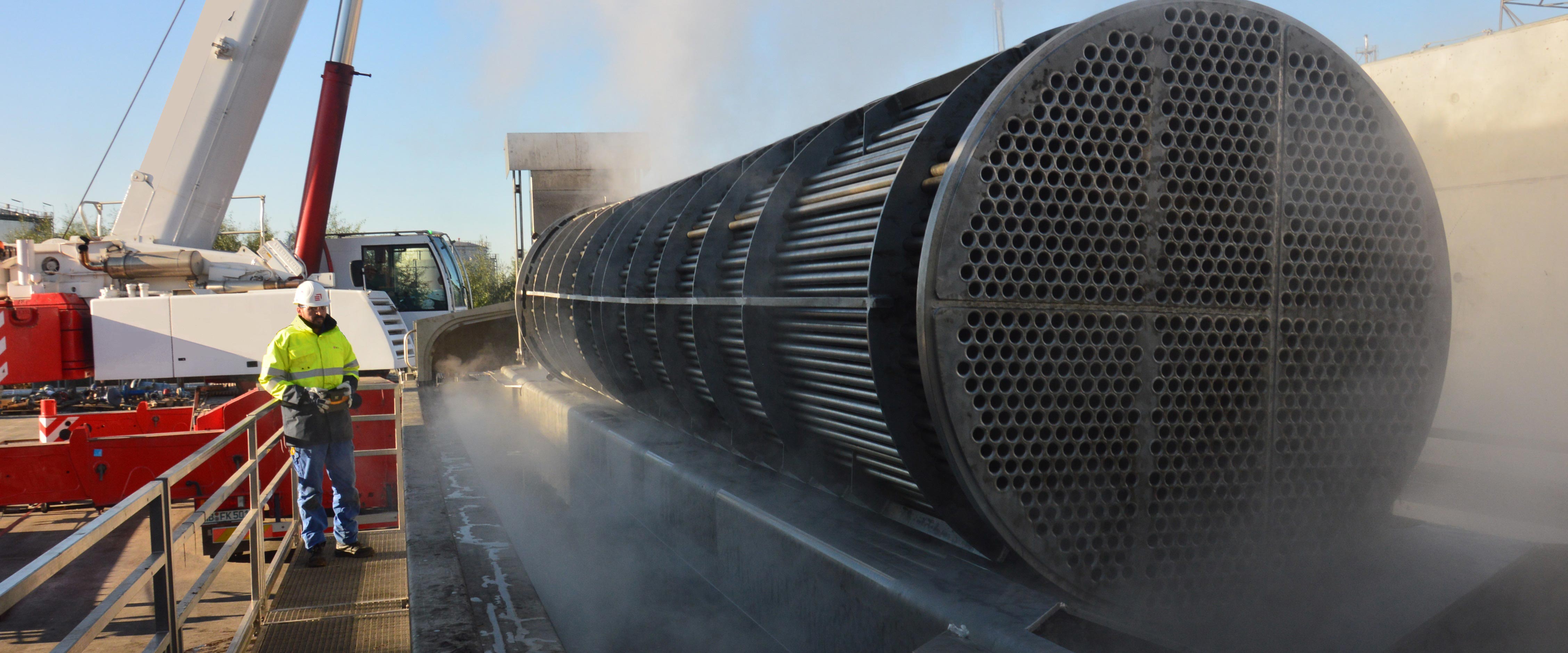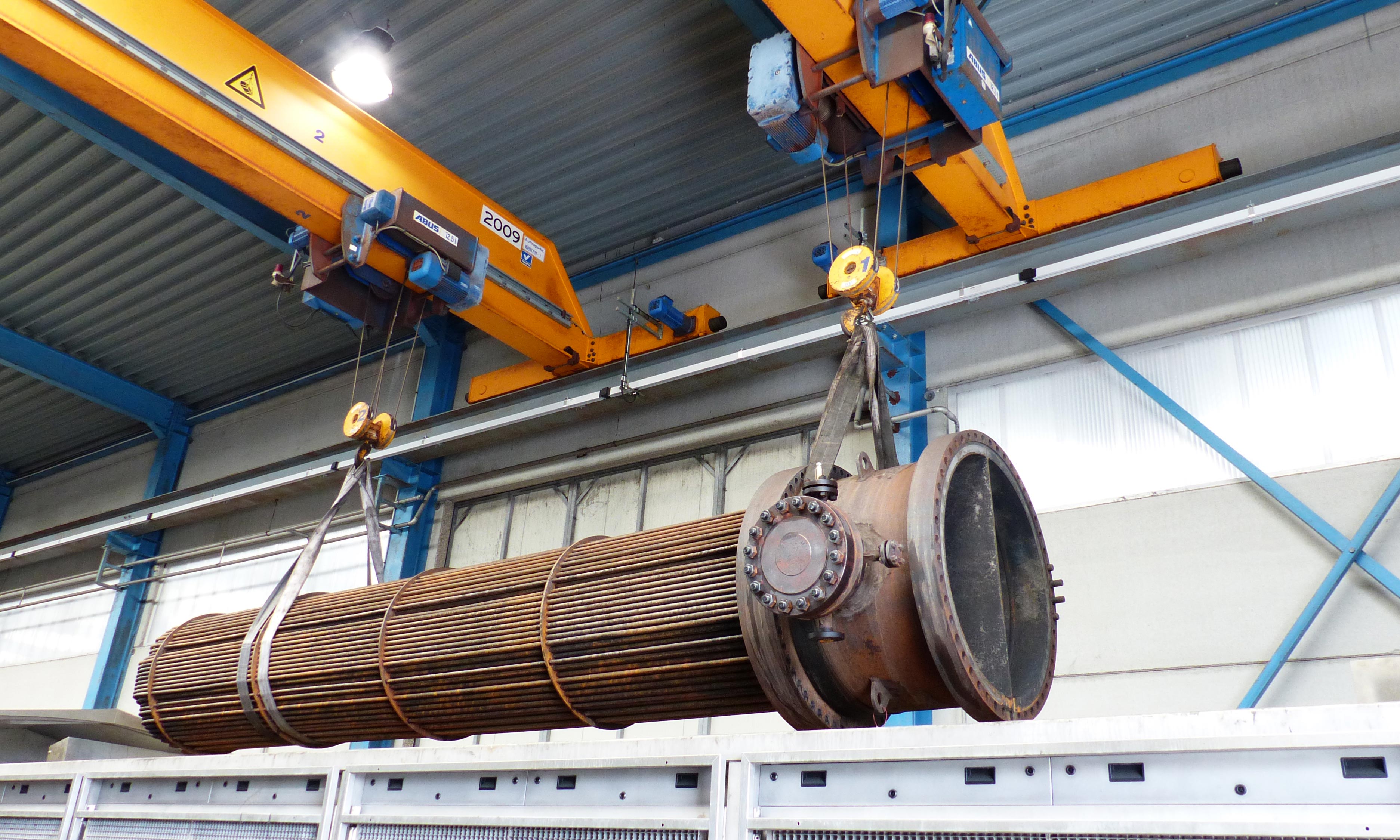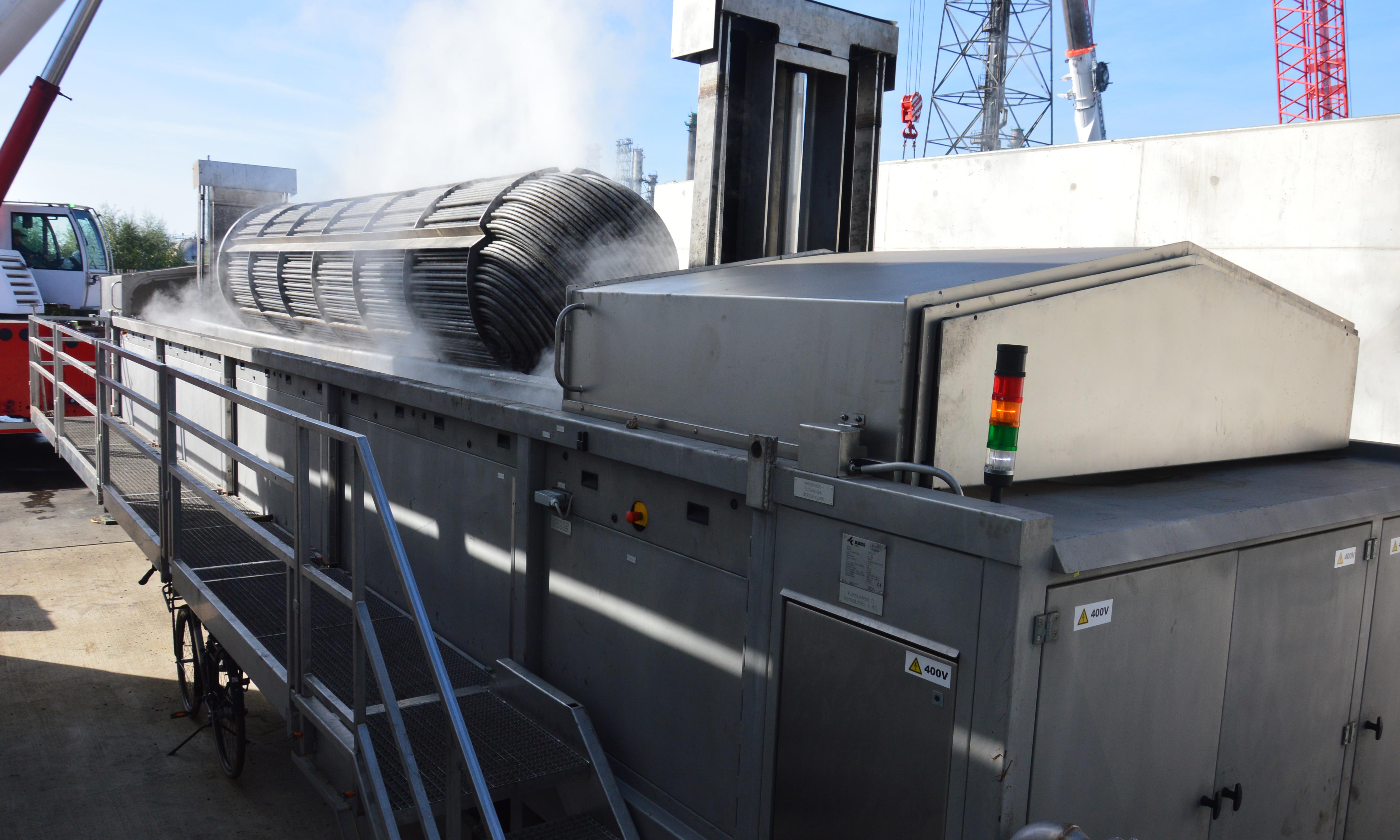 Onze ultrasoon reinigingsunit biedt ruimte voor het reinigen van vervuilde bundels van warmtewisselaars en ander equipment met een afmeting tot 9 x 2 meter. De hefcapaciteit van het hydraulische liftsysteem bedraagt 30ton